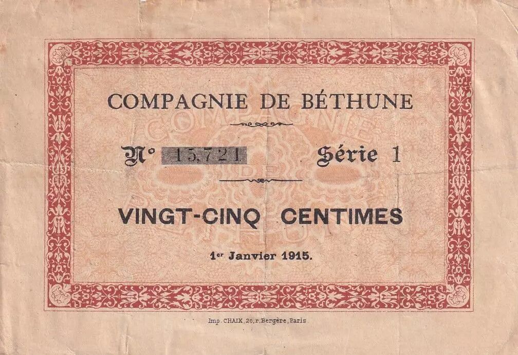 This French emergency banknote was issued by the Compagnie de Béthune. Its face value is 25 centimes. The banknote was issued on January 1, 1915.