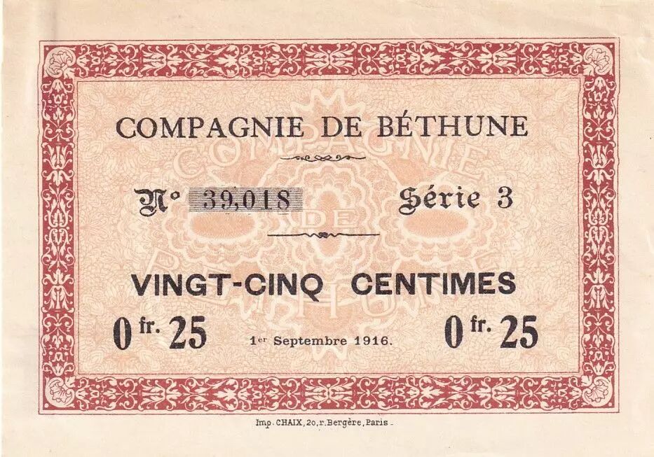 This French emergency banknote was issued by the Compagnie de Béthune on September 1, 1916. It represents a nominal value of 25 centimes. The issuance of this type of banknote is part of the context of the Common and City Necessities during the period from 1914 to 1918.