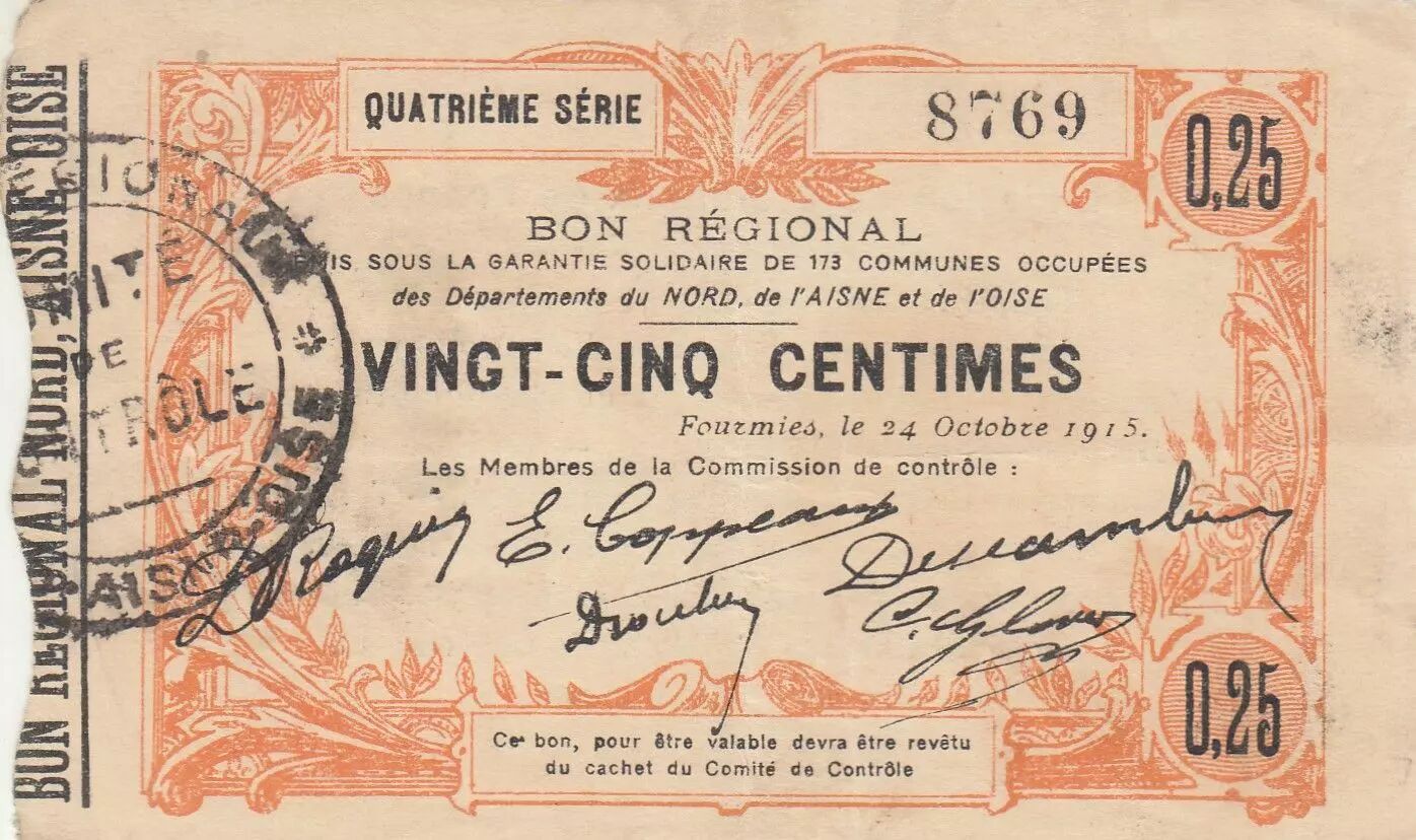 Banknote France 25 Cents - Fourmies - Regional Coupon - 24-10-1915 - Fourth serial