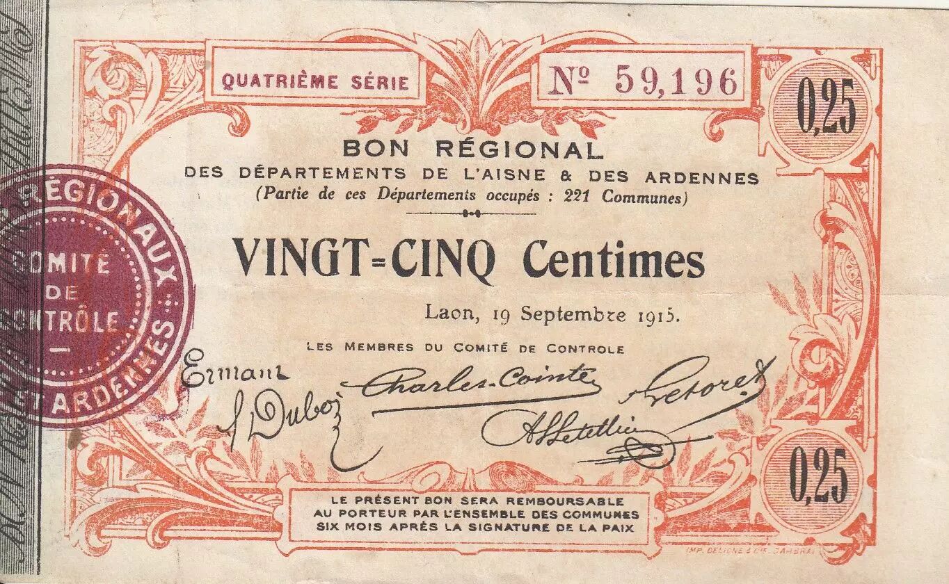 Banknote France 25 Cents - Laon - Regional Coupon - 19-09-1915 - Fourth serial