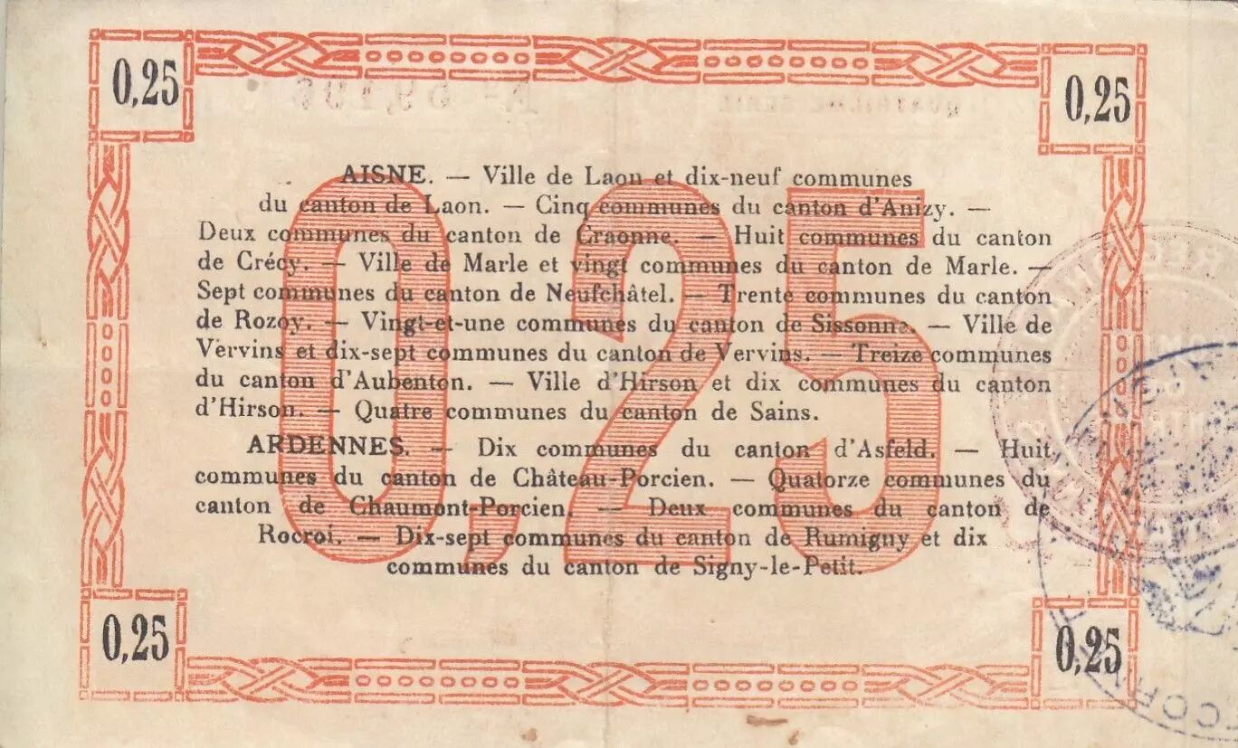 Home > French Banknotes > Necessity Money (1789-1945) > City and Municipal Bonds 1914-1925 > France 25 Cents - Laon - Regional Coupon - 19-09-1915 - Fourth serial