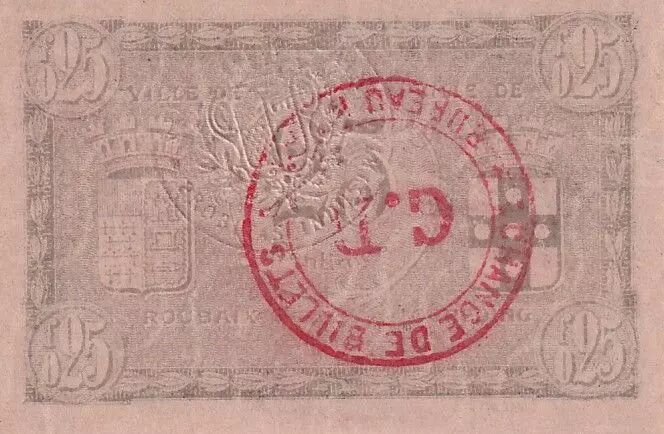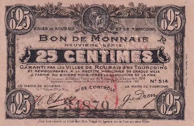 This 25-cent banknote was issued by the towns of Roubaix and Tourcoing. It belongs to the ninth series of this issue and dates from December 16, 1916.