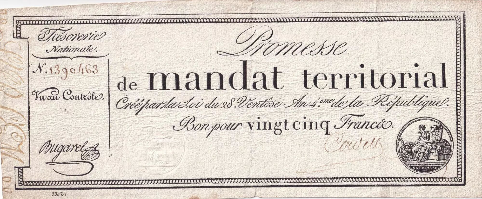 Accueil > Archivage > France 25 Francs - Mandat Territorial - 28 Ventose An IV (18.03.1796) - TTB+