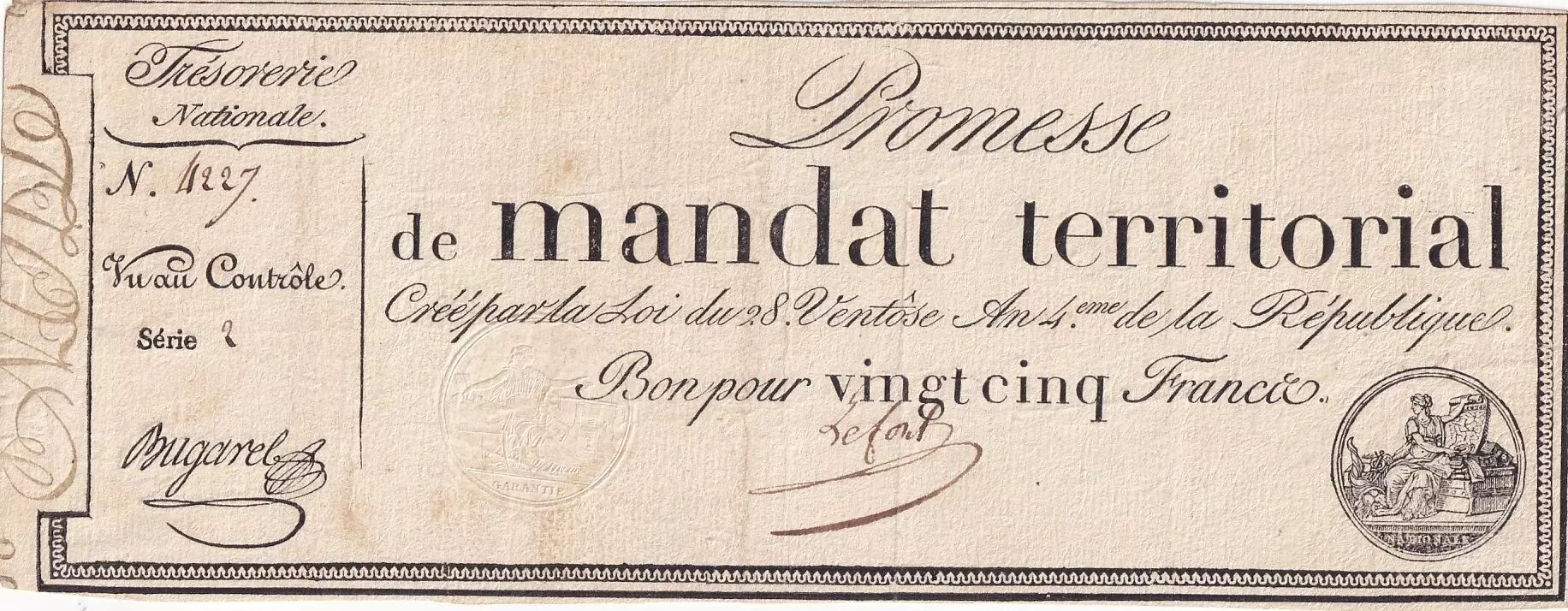 Home > French Banknotes > Assignats > 100 Francs > France 25 Francs - Territorial mandate with serial 2 - 28 Ventose An IV (18.03.1796) - VF