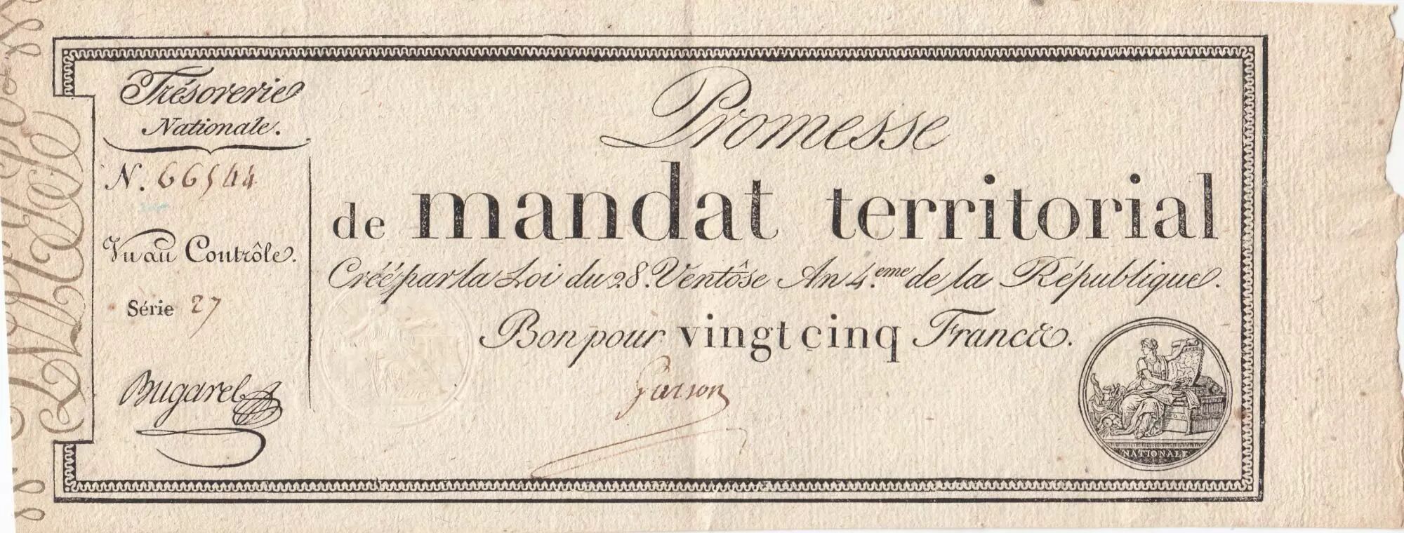 Home > French Banknotes > Assignats > 100 Francs > France 25 Francs - Territorial mandate with serial 27 - 28 Ventose An IV (18.03.1796)