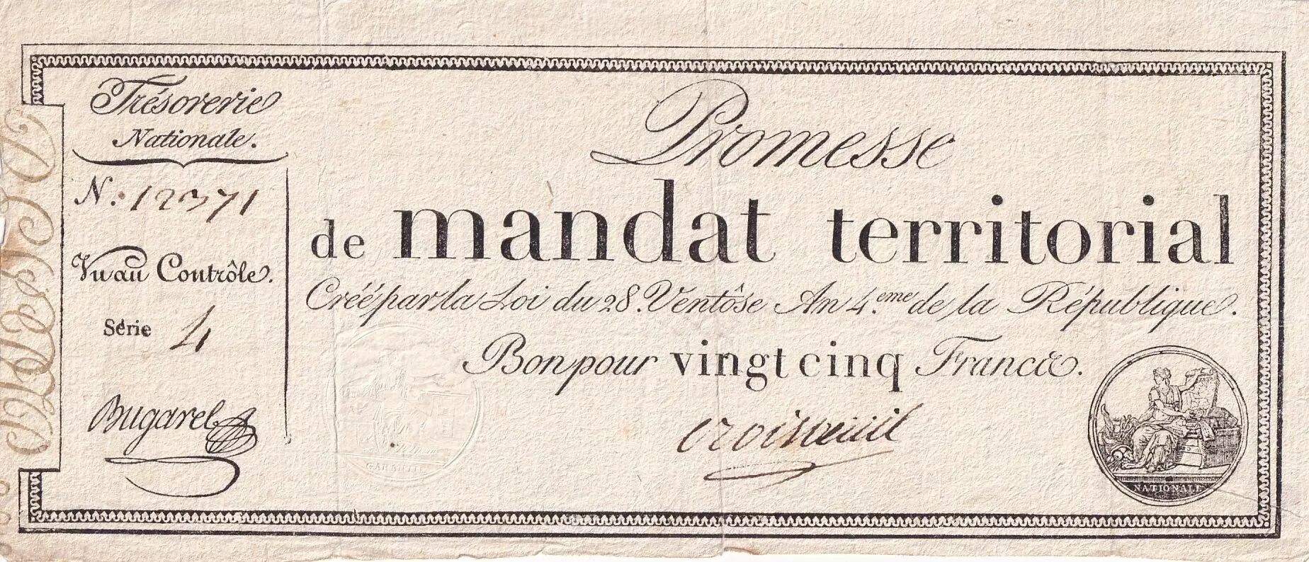 Home > > France 25 Francs - Territorial mandate with serial 4 - 28 Ventose An IV (18.03.1796) - VF