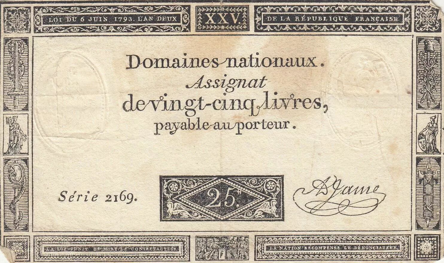 Banknote France 25 Livres - Black print - 06-06-1793 - Sign. Jame - Serial 2169