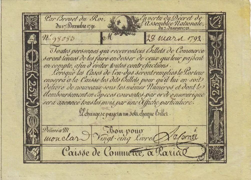 Banknote France 25 livres - Caisse de commerce - 1792