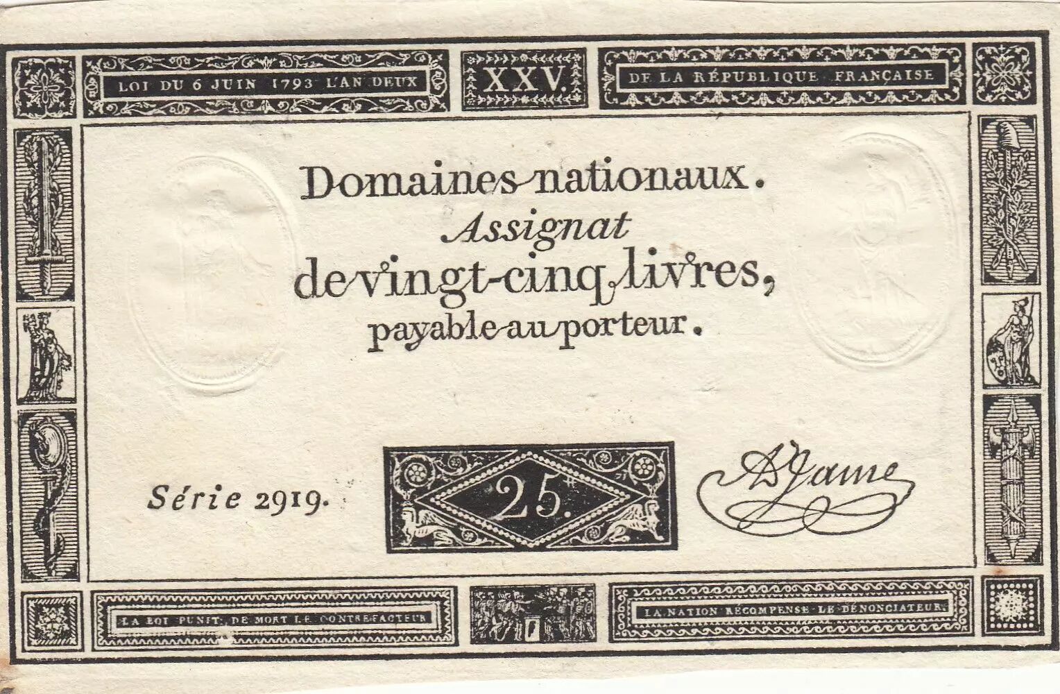 Billet France 25 Livres - Impression noire - 06-06-1793 - Sign. Jame - Série 2919