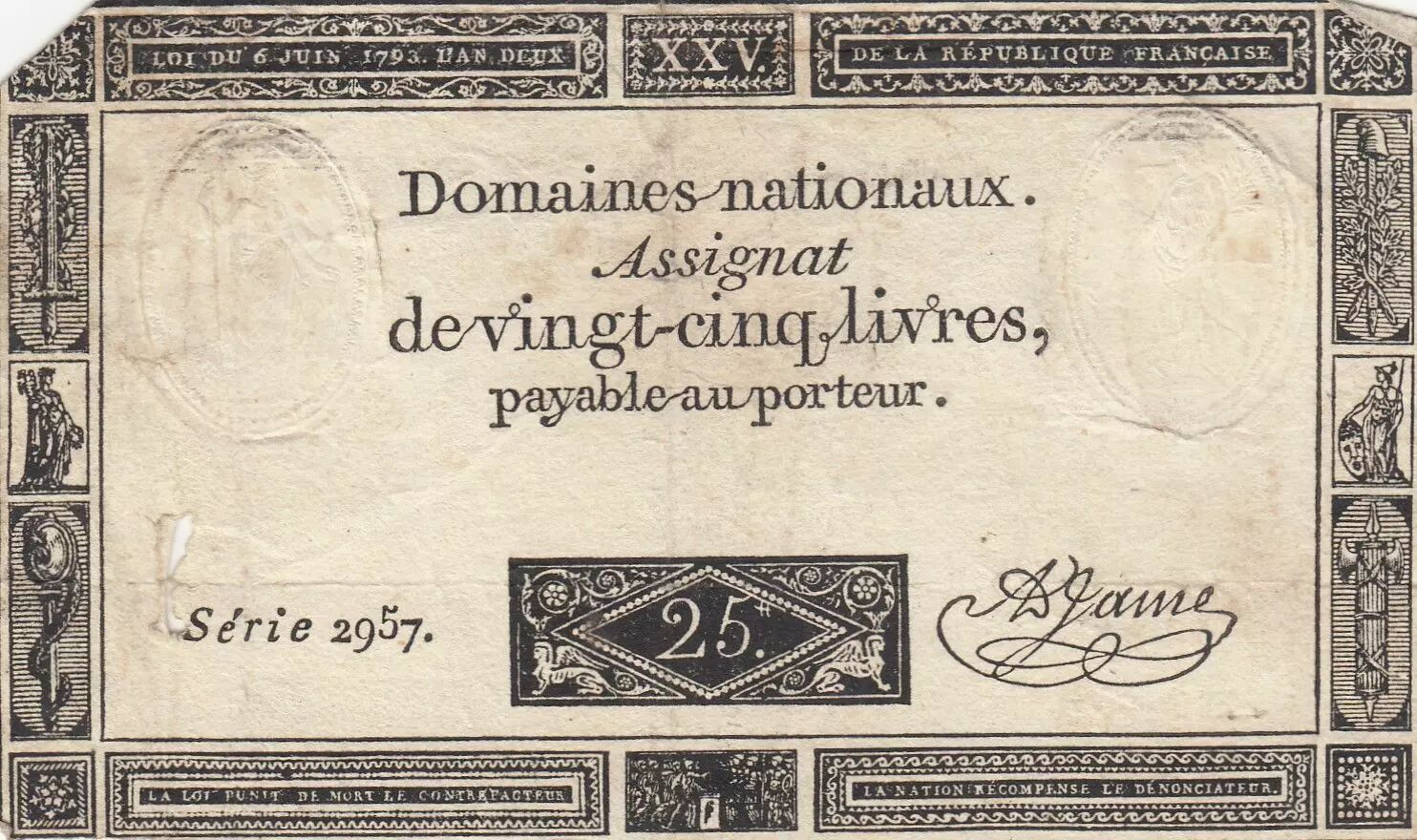 Accueil > Archivage > archivage-Archivage > France 25 Livres - Impression noire - 06-06-1793 - Sign. Jame - Série 2957