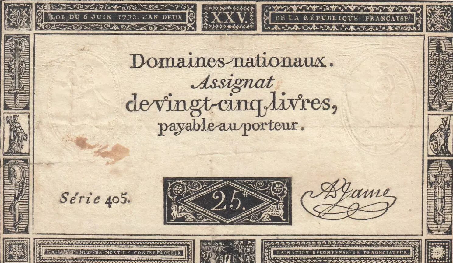 Accueil > Archivage > archivage-Billets Français > France 25 Livres - Impression noire - 06-06-1793 - Sign. Jame - Série 405