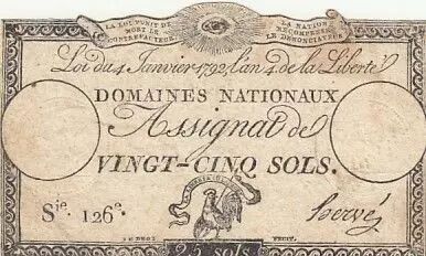 Banknote France 25 Sols - Coq - 04-01-1792 - Sign. Hervé - Serial 126