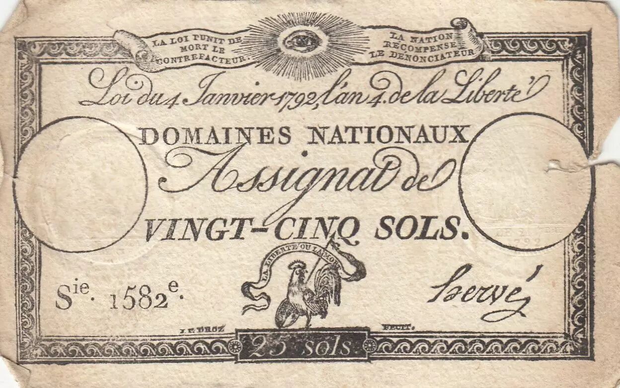 Banknote France 25 Sols - Rooster - 04-01-1792 - Sign. Hervé - Serial 1582
