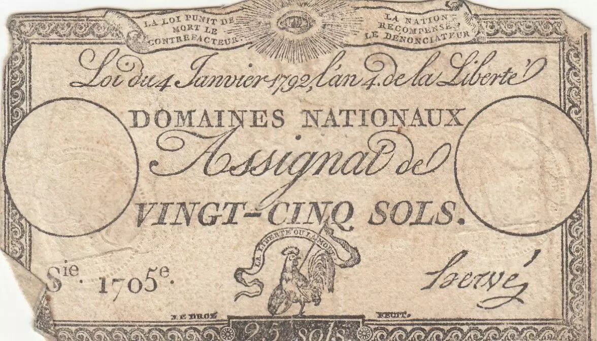 Banknote France 25 Sols - Rooster - 04-01-1792 - Sign. Hervé - Serial 1705
