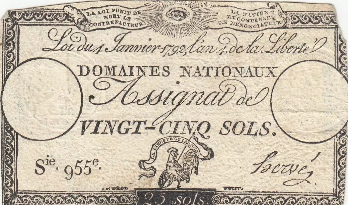 Banknote France 25 Sols - Rooster - 04-01-1792 - Sign. Hervé - Serial 955