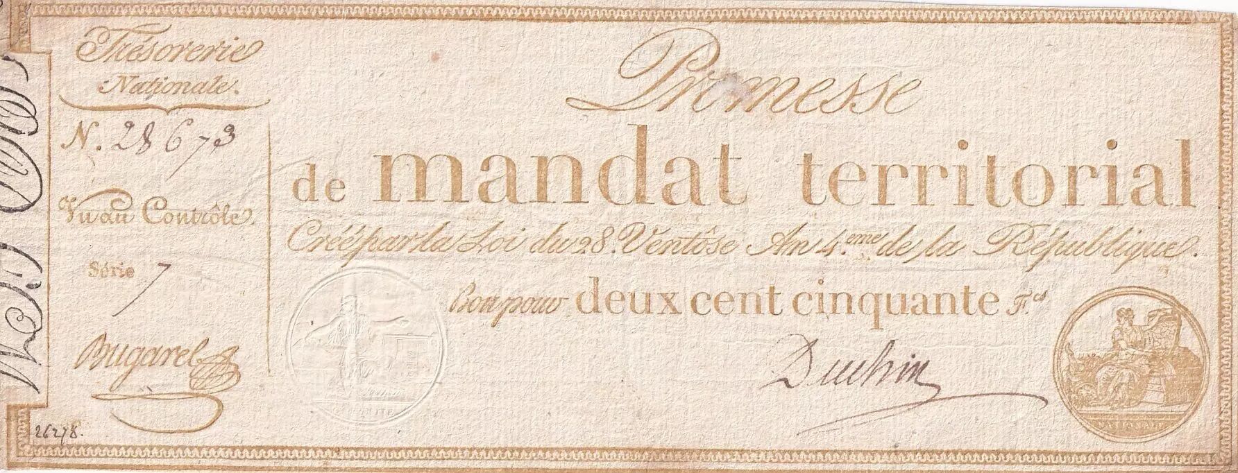 Accueil > Archivage > France 250 Francs - Mandat Territorial avec série 7 - 1796 - TTB