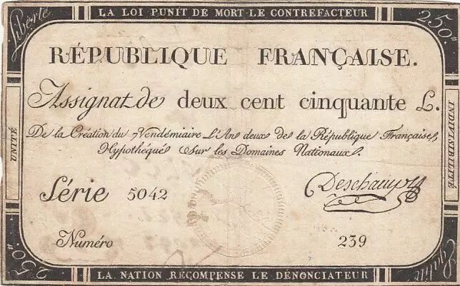 Billet France 250 Livres - 7 Vendemiaire An II - 28.9.1793 - Sign. Deschamps - Série 5042