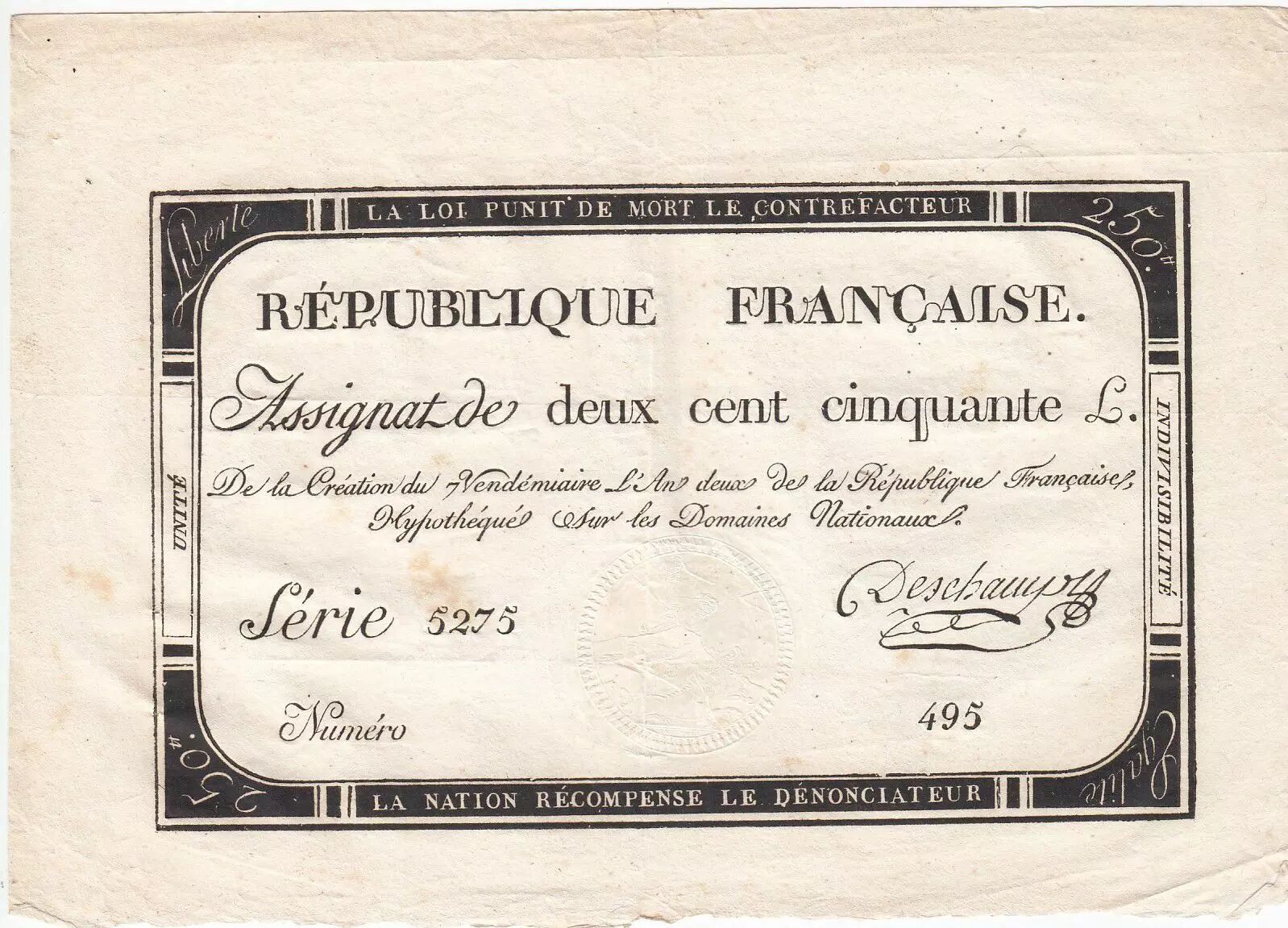 Billet France 250 Livres 7 Vendemiaire An II - 28.9.1793 - Sign. Deschamps - TTB+