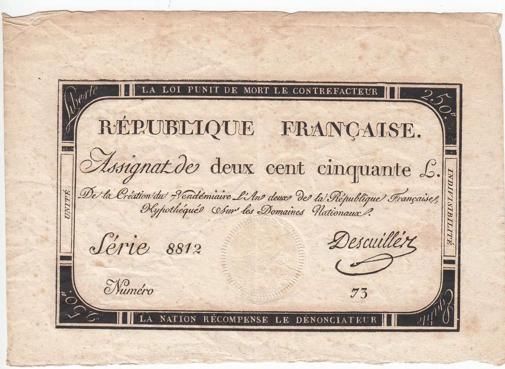 Accueil > Archivage > archivage-Archivage > France 250 Livres 7 Vendemiaire An II - 28.9.1793 - Sign. Descuiller - TTB