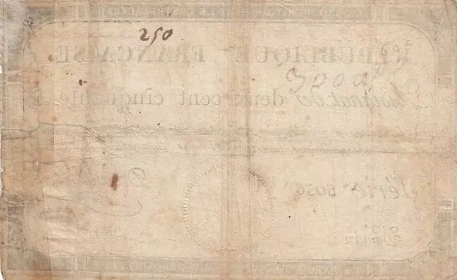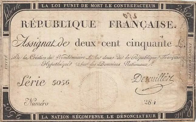 Banknote France 250 Livres - 7 Vendemiaire An II - 28.9.1793 - Sign. Desuillier