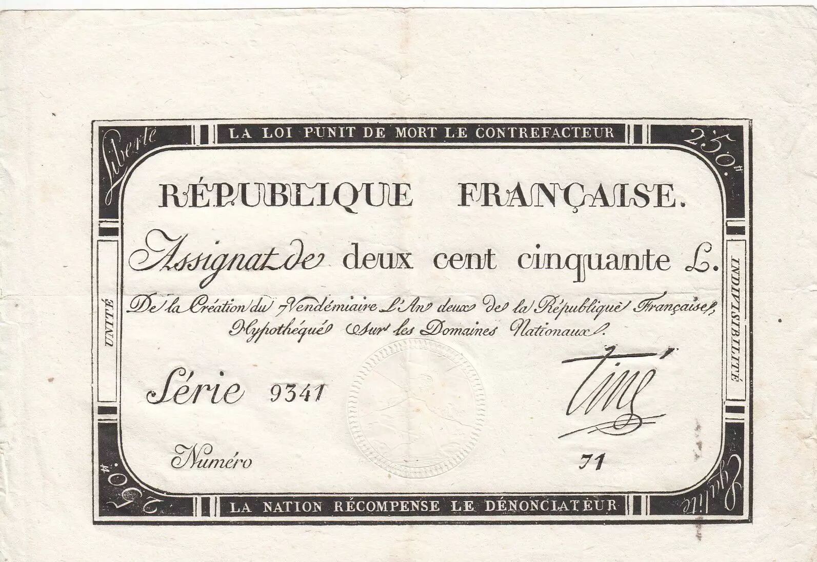 Accueil > Billets Français > Assignats > 250 Livres > France 250 Livres 7 Vendemiaire An II - 28.9.1793 - Sign. Tiné - TTB+