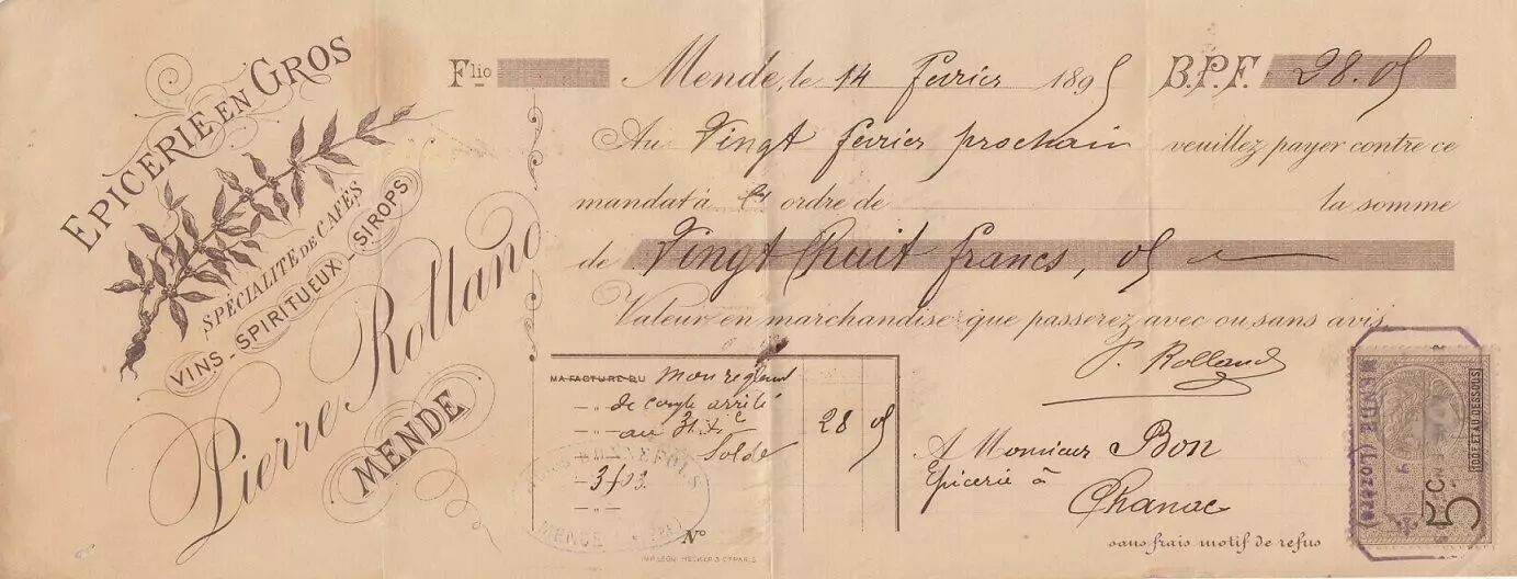 Billet France 28 francs - Reçu de chèque de banque - Épicerie en gros - 1899