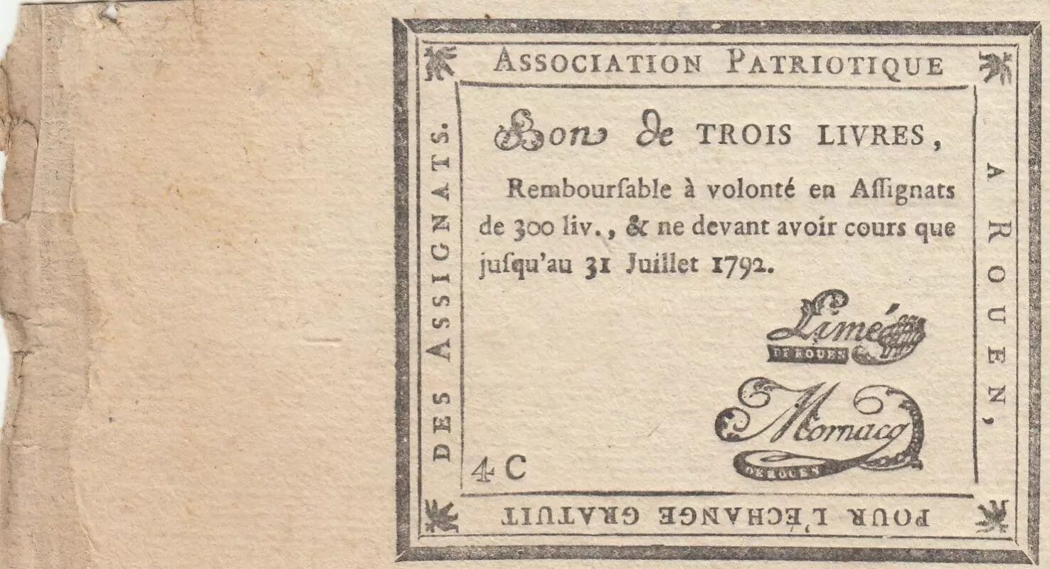 Home > French Banknotes > Necessity Money (1789-1945) > Confidence Notes 1789-1793 > France 3 Livres - Seine-inférieure - Rouen - Patriotic association - 31-07-1792