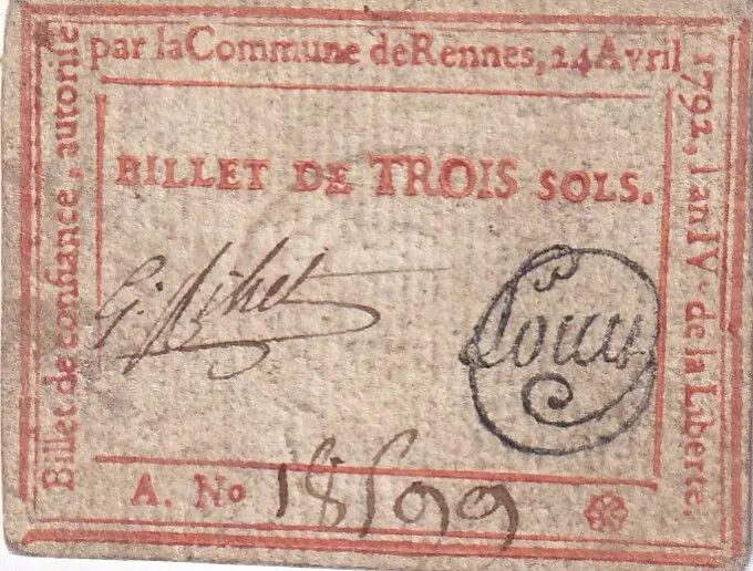 Banknote France 3 Sols - Ile et Vilaine - Commune de Rennes - 1792