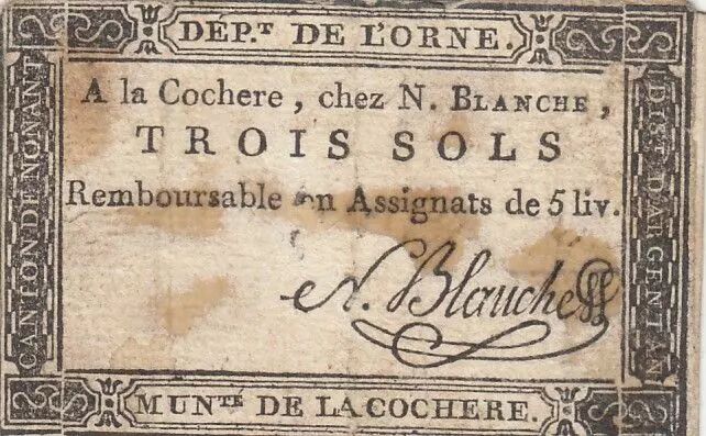 The great typographical diversity of N. Blanche's vouchers confused people. Thus, citizen Jacques Cadiou of the parish of Ménil-Froger had his trust notes confiscated pending proof of their authenticity.