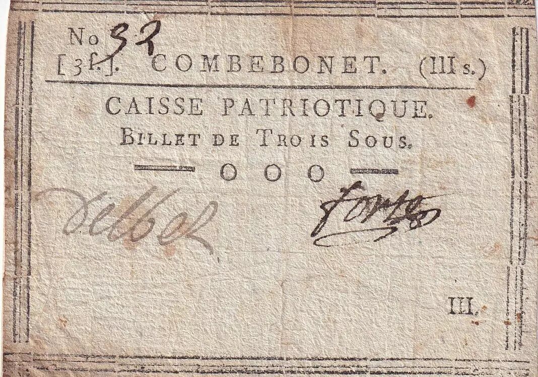 Banknote France 3 Sous - Lot et Garonne - Caisse Patriotique de Combebonet - 1792