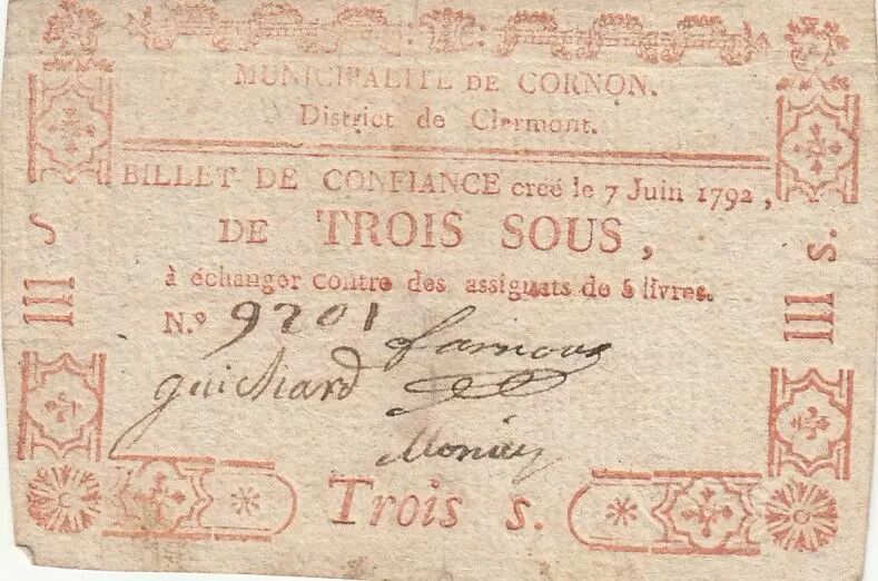 Billet France 3 sous - Puy de dôme - Municipalité de Cornon - 1792