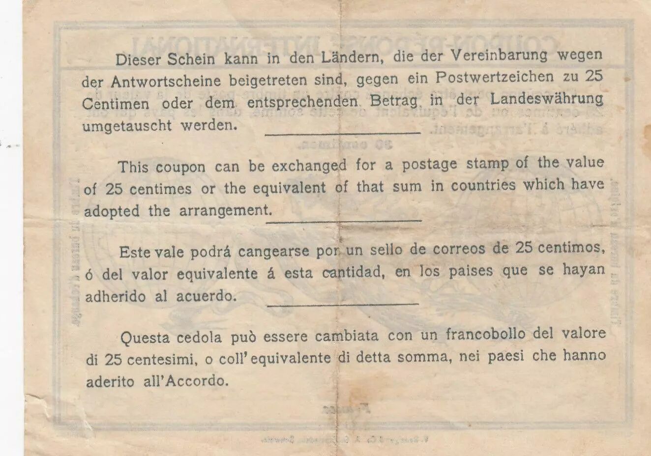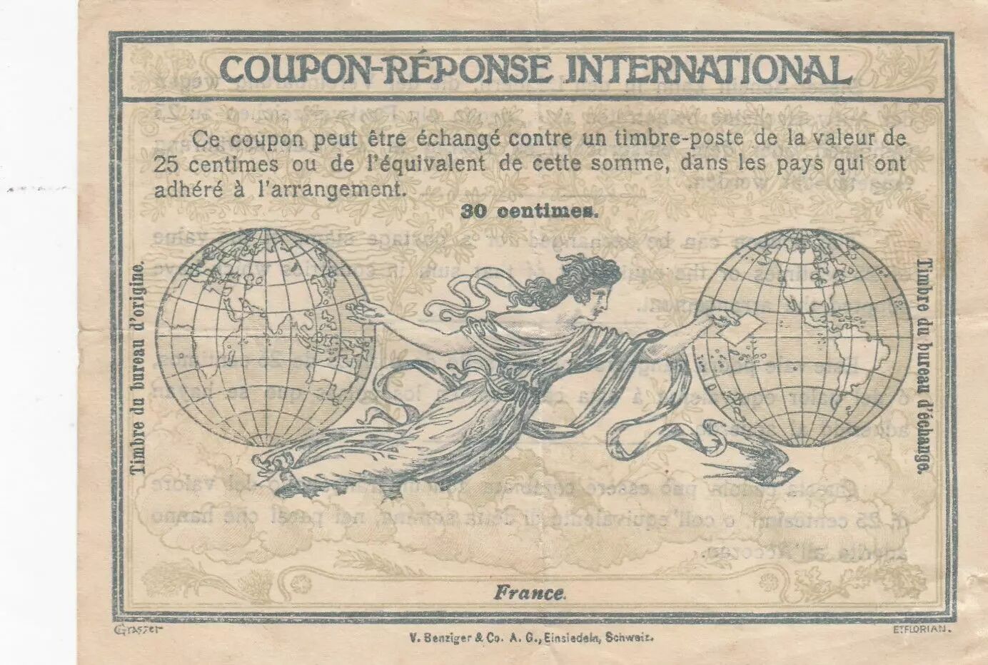 Established with the tariff of October 1, 1907, an international reply coupon is defined as a "document with fiduciary value intended to cover the postage costs of a standard letter to foreign correspondents" (as per Larousse). This international reply coupon, sold for 30 cents, nonetheless allowed for the mailing of a letter abroad with a face value of 25 cents. In essence, it was the perfect counterpart to our "semeuse" in postal terms.