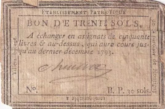 Banknote France 30 Sols - Calvados - Villers Bocage - Etablissement Patriotique - 1792 - Rare