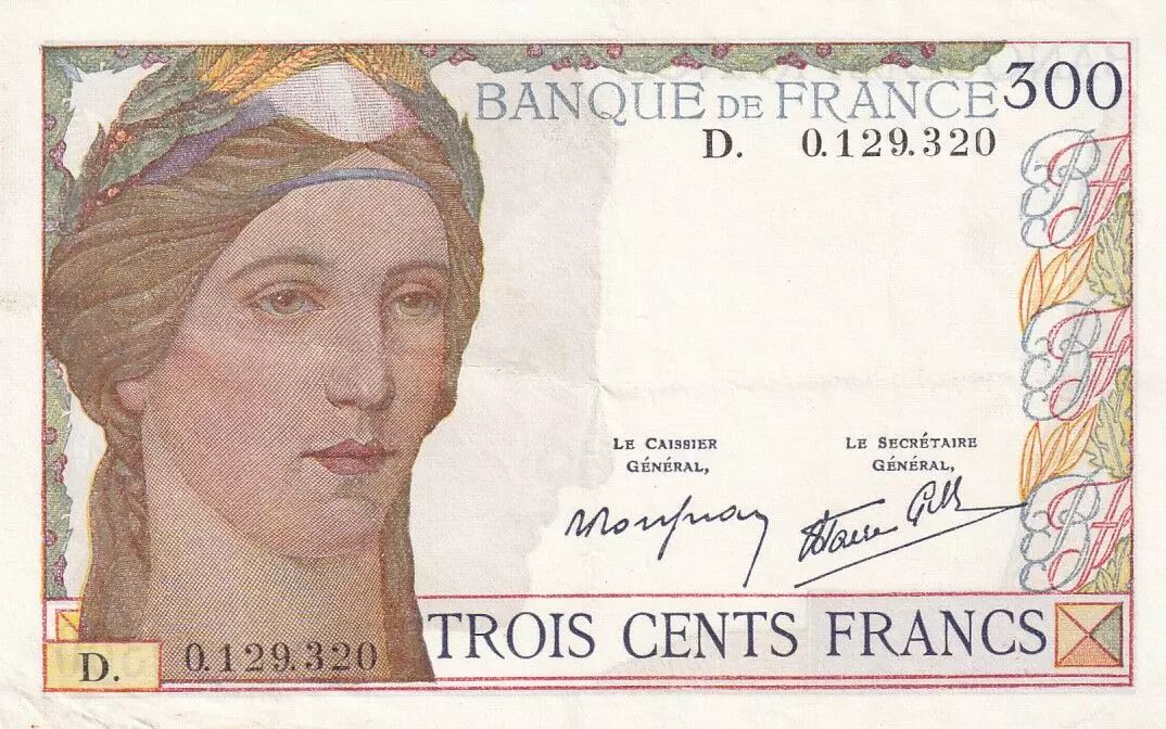 On the front of the banknote, on the left, there is a representation of Ceres, the Roman goddess of agriculture, harvests and fertility. The mention "BANQUE DE FRANCE" is inscribed, followed by the face value "TROIS CENTS FRANCS".