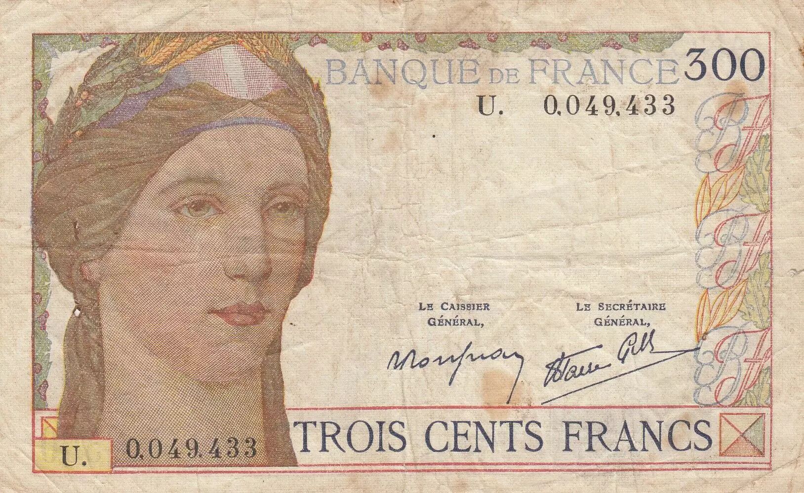 The 300 Francs Cérès banknote, issued on February 9, 1939, is a specimen from the Banque de France. This banknote has a nominal value of 300 francs.