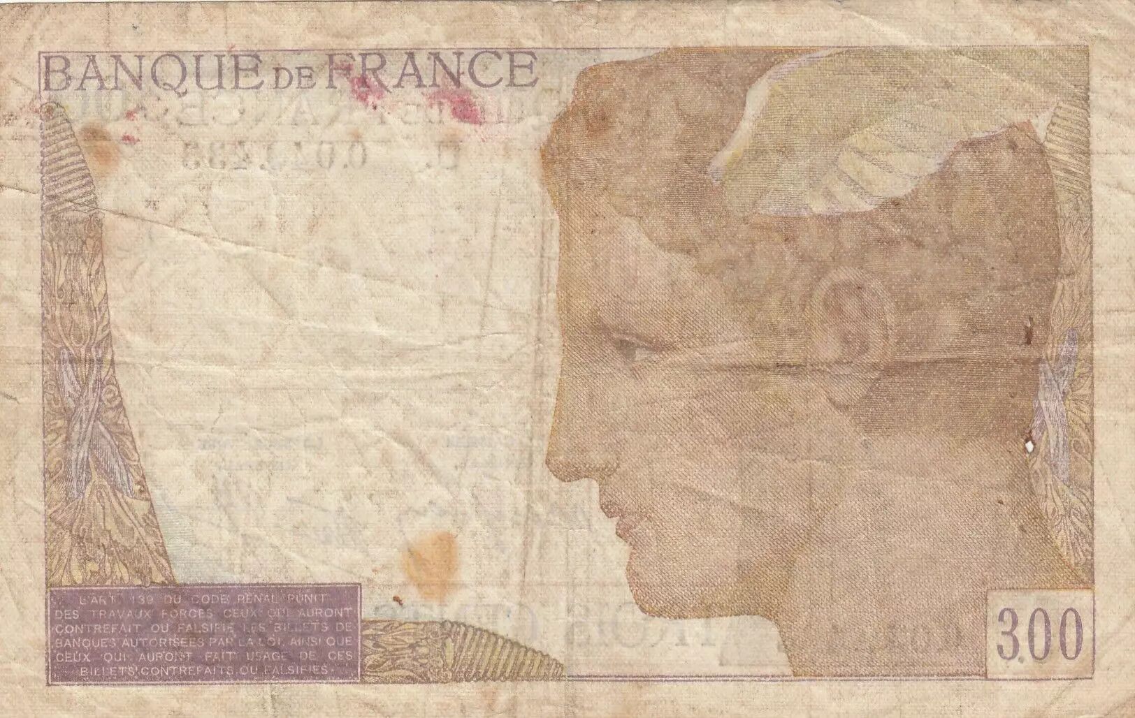 On the back, we observe a profile head of Mercury, facing to the right. The mention "BANQUE DE FRANCE" is also found there. A legal inscription, referring to Article 139 of the Penal Code, warns of the penal sanctions incurred in the event of counterfeiting or falsification of banknotes authorized by law, as well as for the use of such counterfeit or falsified banknotes. The nominal value "300" is also present. As for the front, Ernest Deloche is designated as the engraver and Clément Serveau as the designer. The writing is in Latin.