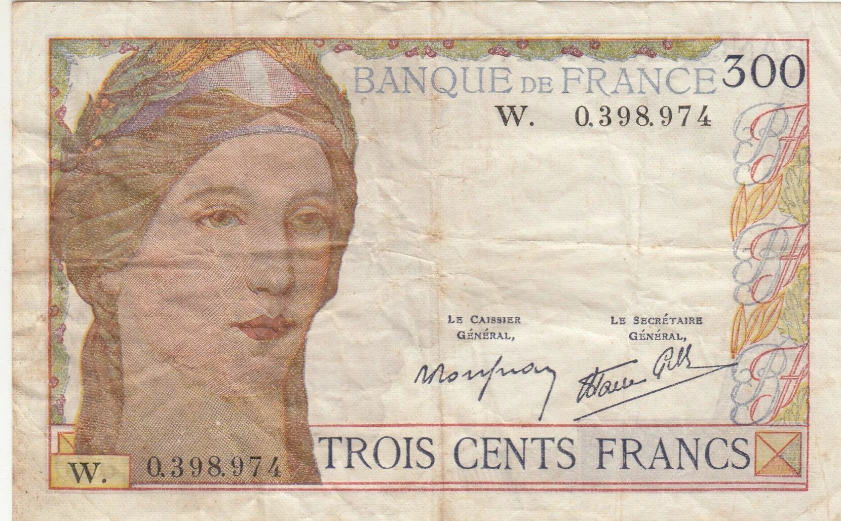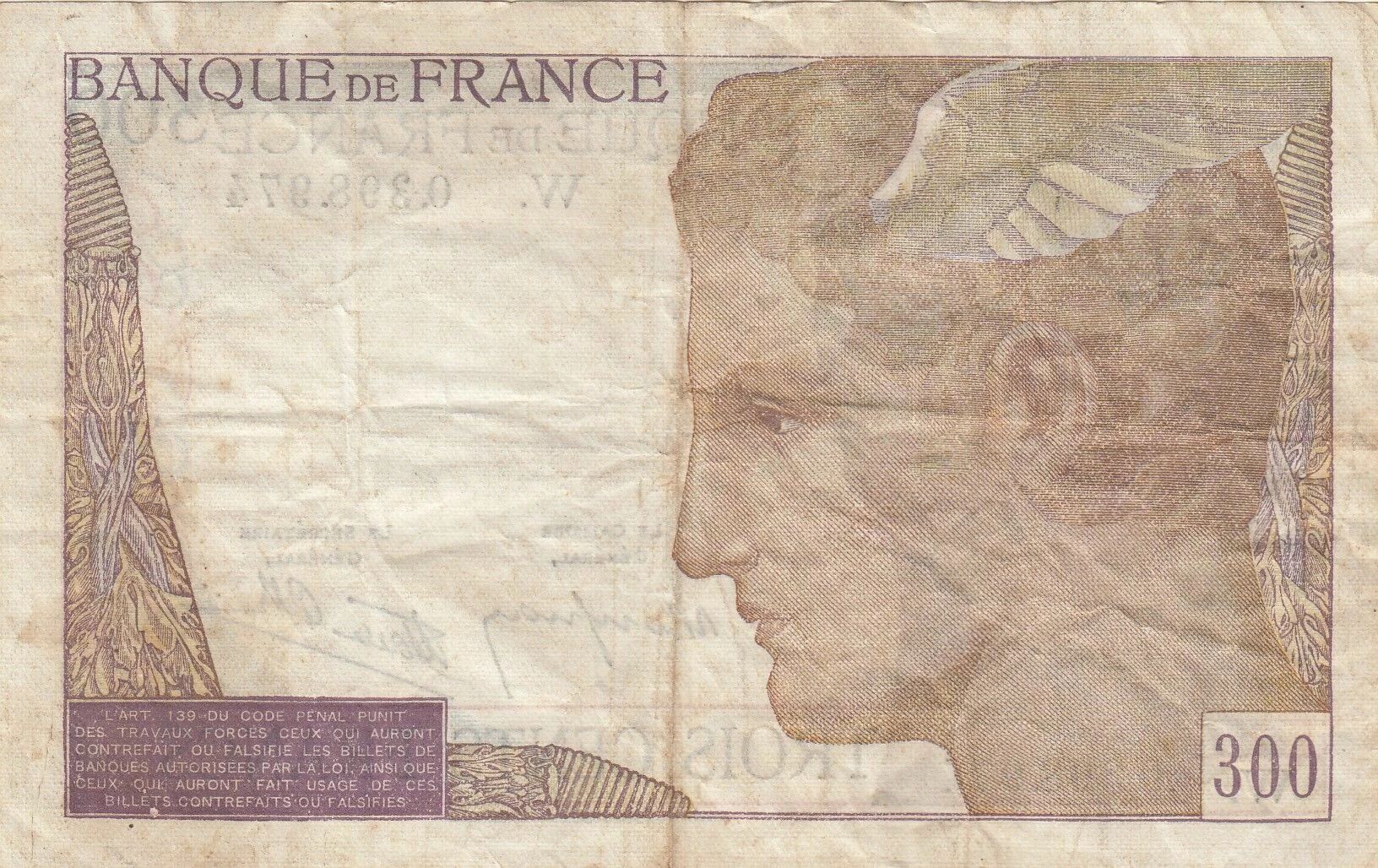 Le billet de 300 Francs Cérès, daté du 24 novembre 1938, est un exemple de la production fiduciaire française de la période précédant la Seconde Guerre mondiale. Ce billet se distingue par sa valeur nominale de 300 francs, une somme significative à l'époque, reflétant son rôle dans les transactions économiques courantes.
