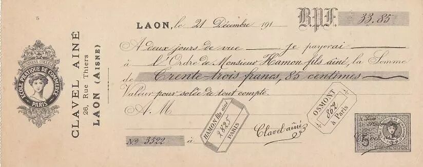 Accueil > Billets Français > Billets de Nécessités (1789-1945) > Bons de villes et de communes 1914-1925 > France 33,85 francs - Reçu de chèque de banque - Paris - 21-12-1912