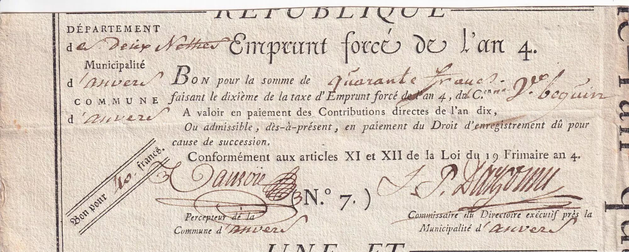 Home > > France 40 Francs - Emprunt Forcé - Year 4 (1796) - Belgique - Anvers - XF