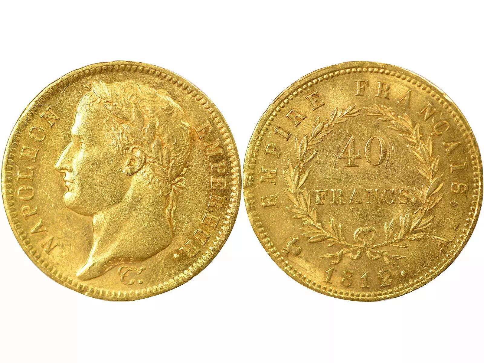 The reverse of the coin features a crown formed of two laurel branches, inside which is the inscription "EMPIRE FRANÇAIS?". The face value of "40 FRANCS?" is also indicated, as well as the year of issue "1812?" and the mint mark "A". Jean-Pierre Droz also engraved this face.