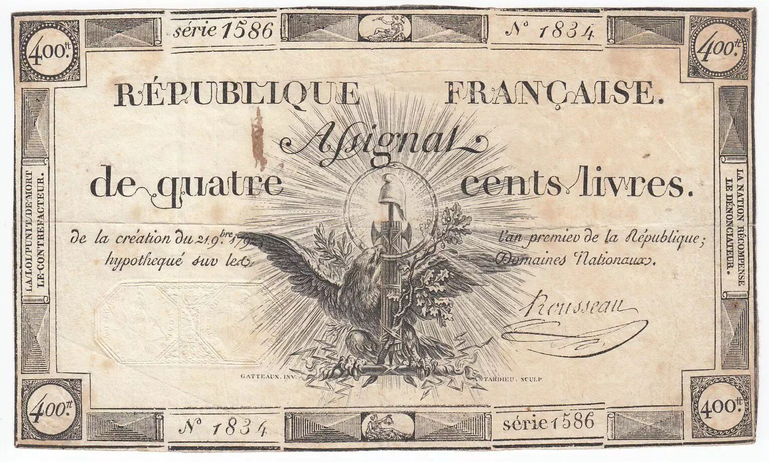 Billet France 400 Livres 21-11-1792 - Sign. Rousseau Série 1586 - TTB