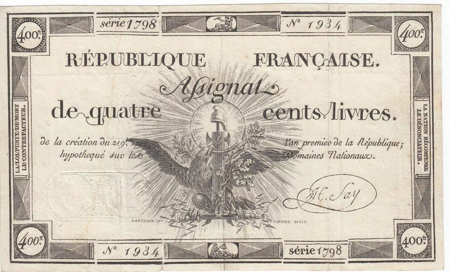 Billet France 400 Livres 21-11-1792 - Sign. Say Série 1798 - TTB