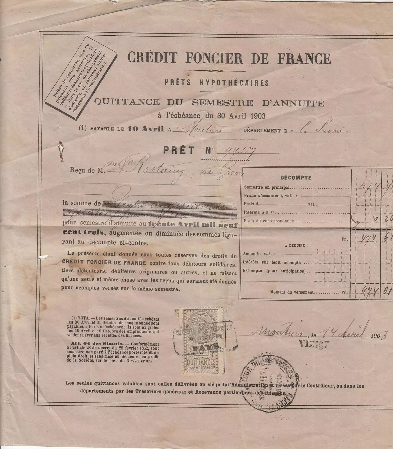 Billet France 474 francs - Reçu de chèque de banque - Crédit foncier de france - 1903