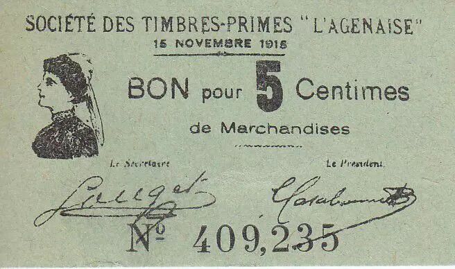 Billet France 5 Centimes Agen Sté Timbres Primes L'Agenaise