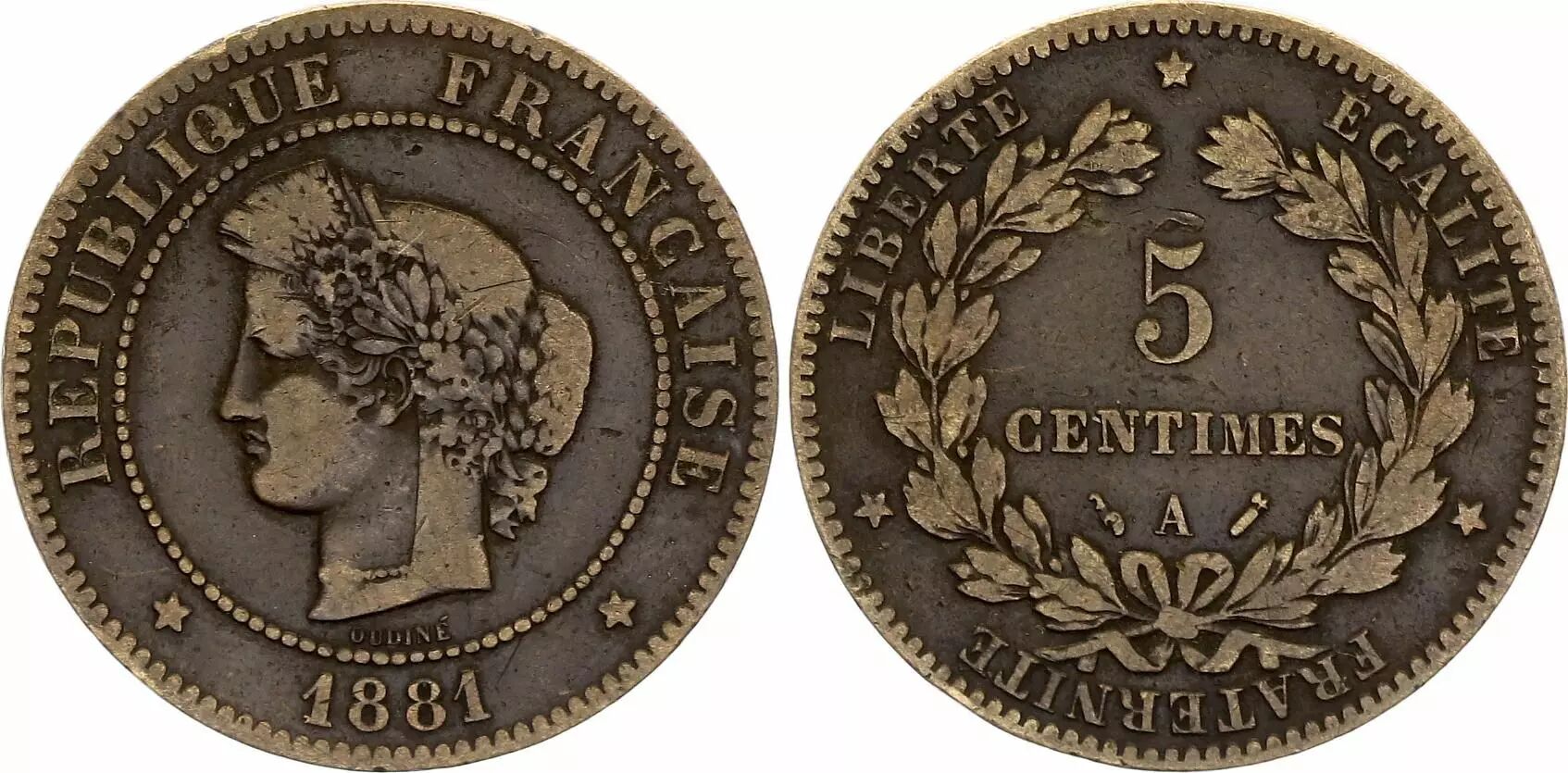 Accueil > Archivage > France 5 Centimes Cérès - Troisième République - 1881 A Paris