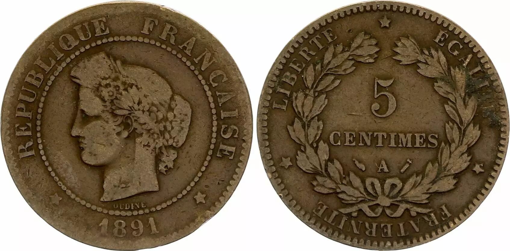 Pièce France 5 Centimes Cérès - Troisième République - 1891 A Paris
