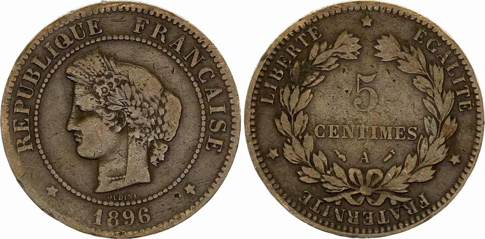 Accueil > Archivage > archivage-Monnaies françaises (470 à 2002) > France 5 Centimes Cérès - Troisième République - 1896 Faisceau A Paris