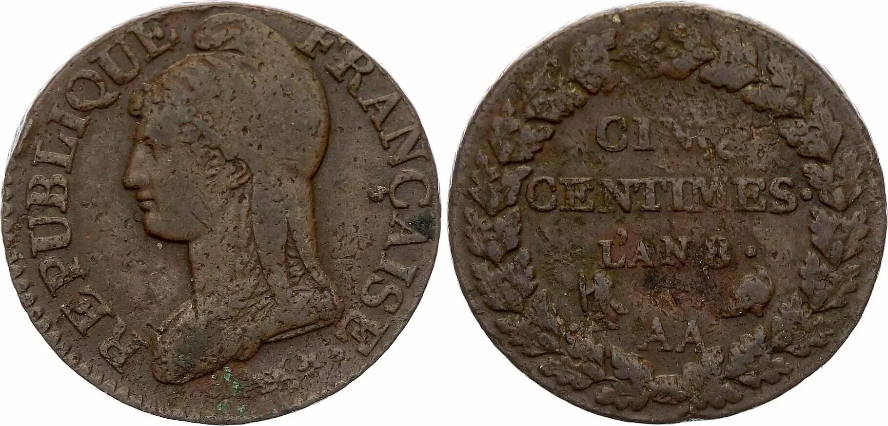 Home > French coins (470 à 2002) > Modern Currencies (1789 to 2002) > 5 Centimes > France 5 Centimes Dupré - An 8 (1799-1800) - AA Metz