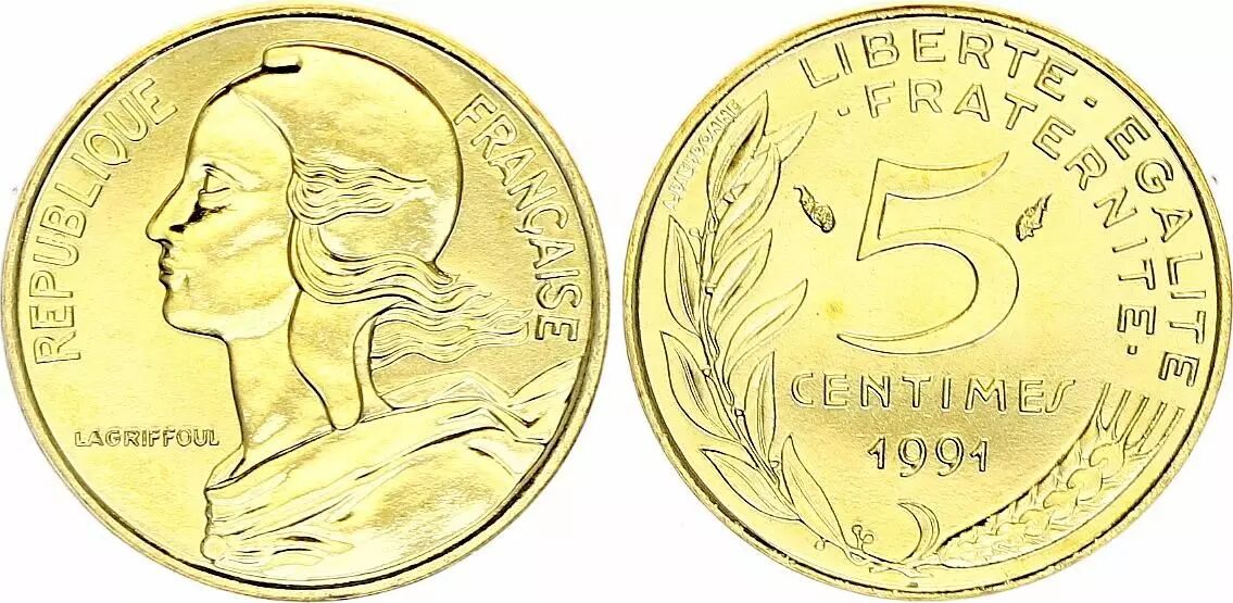 Accueil > Monnaies françaises (470 à 2002) > Monnaies Modernes (1789 à 2002) > 5 centimes > France 5 centimes Lagriffoul - 1991 BU frappe médaille
