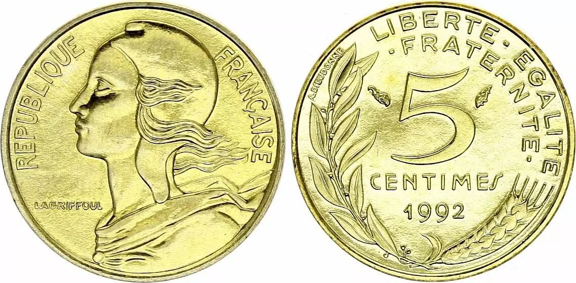 Accueil > Monnaies françaises (470 à 2002) > Monnaies Modernes (1789 à 2002) > 5 centimes > France 5 centimes Lagriffoul - 1992 BU frappe médaille
